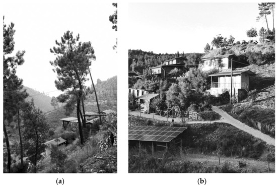 The study area Vale de Moses: (a) view from the mountain terrace over the valley; (b) existing buildings of the Retreat on the mountain terrace below.