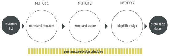 The permacultural design was proposed and organized in a three-step method as described in Figure 4. Aiming to structure the design and its elements specifically for pre-existing circumstances with a focus on environmental sustainability and the improvement of human health, these design methods are mimicking patterns and relationships found in nature.