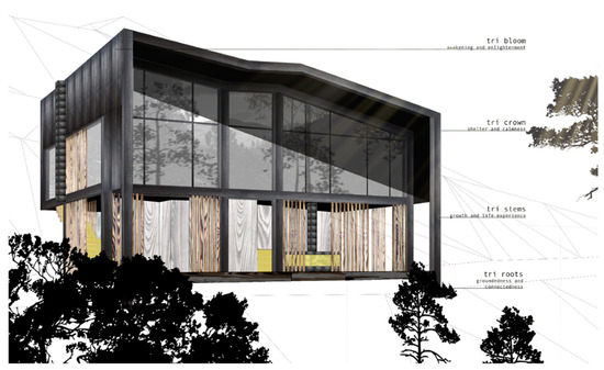 The atmosphere is Tri Shala’s second dimension. This dimension interacts with the sense of the environment. The atmosphere of a place is what one can sense, what creates memories, and the longing to return to a particular place. The essence of a place, felt by exploring the given historical, cultural, and natural environment, has inspired the creation of the new Yoga house of Vale de Moses—the Tri Shala. Pronounced phonetically ‘Tri’ also plays along with the English term tree. Considering the strong connection to the local community, the new Shala forms the forest home—a place to find shelter, community and connectedness. Yoga-wise, a tree in its spiritual context can be seen as the expansion of the soul and spiritual awakening. Interfering with the forest landscape of the foothills of Serra da Estrela, Tri Shala is woven into the forest ecosystem, as Figure 7 shows. Its roots are grounded in the earth and thus represent a stable base for inner growth. The stems of Tri Shala grow up through the thicket of the forest and stand for inner growth and life experience. The crown of the tree provides shelter and calmness, which allows us to reach a meditative state of mind during Yoga practice. The blooming of the flowers on top of the tree in the sunlight stands for spiritual awakening and enlightenment.