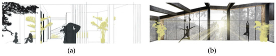 The Yoga space floats above the ground floor facing south-west. The Yoga space allows melting into nature, to be secure, sheltered and still in the middle of the forest’s tree crowns. In closest touch with nature (Figure 8b).