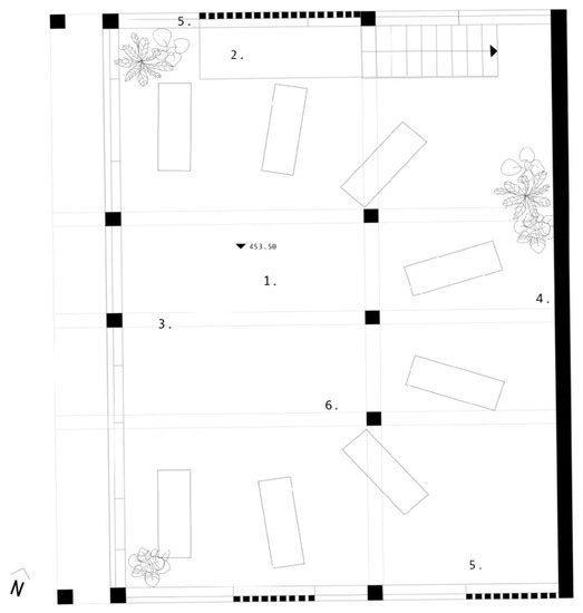Tri Shala’s first floor—the Yoga space in the tree crown. (1) Yoga space, (2) storage, (3) panoramic view of nature, (4) enclosed construction, (5) sun protection, (6) aerial Yoga (Source: compiled by the author).