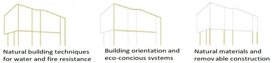 Accordingly, fundamental to any sustainable design is the creation of an inventory to define and limit the design to its essential needs, to minimize the impact on the environment caused by building and construction processes [34]. In the context under study, the inventory addresses the architecture, its design elements in regard to land use, water and energy cycles, and building material and techniques. While the former methods focus on analyzing the site and the placement of necessary design elements to create an eco-conscious concept that focuses on self-sufficiency, resilience and multi-functionality, the latter aims to improve human well-being by creating an esthetically pleasing and mind-calming design.