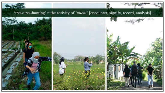 Here, niteni, as the conceptual framework of experiential participatory learning and knowledge production, is applied to the initial activity of field exploration, often called treasure mapping, which seeks to recognize, collect, and map the treasures, including regional land, farming traditions, and people, as potential bases of knowledge and actions for the co-design project. In practice, niteni brings about the memory of embodied/embedded perceptions of the environment and the ways that individuals manage and relate to them [72]. In field activities, the precept induces the students/designers to position the local community as teachers and the area of exploration as a place to gather signs, signifiers, and relations. With the satellite imaging map in their hands, participants walked through the village, taking notes and documenting matters and objects of interests.
