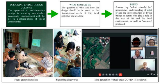 Designers need to investigate opportunities to aid in social transformation not only in terms of their political implications, but also to support social change, potentially in combination with participatory educational approaches [14]. In many regions across the world, such as Indonesia, design education still employs a classical approach, where the user is the passive object of study [15,16,17,18]. In comparison, in the contemporary design discipline, designers must not only comprehend the precept and praxis of the participation design but also facilitate concrete planning and space-making for the co-creation of mutual learning and knowledge [19,20,21,22], encouraging new habits that lead to social change [23,24,25], recognizing regenerative potential in order to mediate the ethical advancement of both human civilization and the natural environment [26,27], recognize local wisdom, traditional technology, and biocultural heritage [28,29,30,31,32,33,34], and address the inconveniently absent relationship between villages and cities [35]. This new participatory design approach seeks to include and actively involve stakeholders, particularly future users or benefit recipients, as design partners or co-designers [36,37].