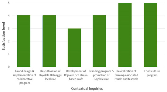 The project in Sabrang village fostered a collaborative attitude among the stakeholders. Here, all involved members participated in the acquisition of new knowledge and knowledge sharing. Based on the evaluation of the 12 farmers’ satisfaction levels, we found that the average level of satisfaction with the activities ranged from 3 to 5 on a 5-point Likert scale, where 5 is highly satisfied (Figure 6 and Appendix A). Meanwhile, based on our qualitative reflections, we believed that the activity was successful and observed that the designers and students learned from the farmers about the true potential of traditional farming, celebratory rituals, and the local food culture built on the esteemed taste of the indigenous rice variety. External stakeholders, who had never stepped into the muddy waters of rice fields, participated from the first step in clearing the field to the planting and care of the rice plants and the harvest.