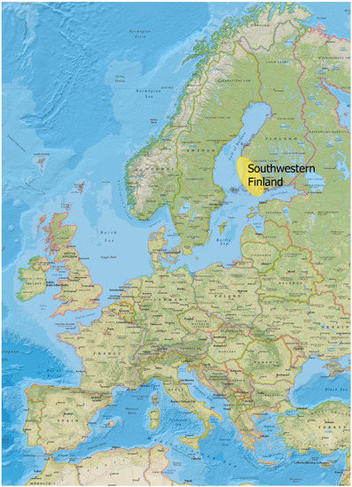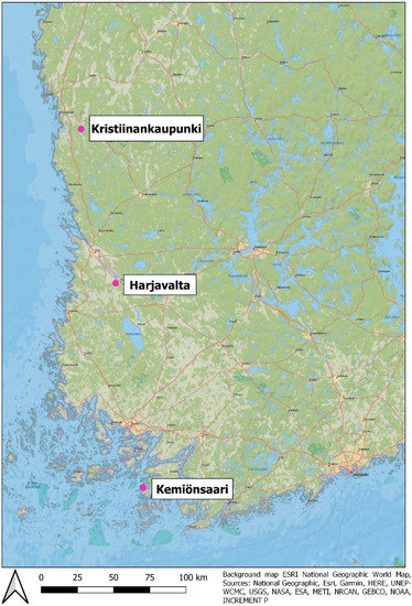 The three areas chosen for closer review, Kemiönsaari, Harjavalta, and Kristiinankaupunki, are located about 100 km apart from each other (Figure 4). Kemiönsaari, in the Southwest Finland region, is the southernmost of the sites, and it is also currently part of the archipelago. The Harjavalta area is in the middle of the Satakunta region, formerly part of the Western Finland Province. The northernmost review area is Kristiinankaupunki, in the Ostrobothnia region.