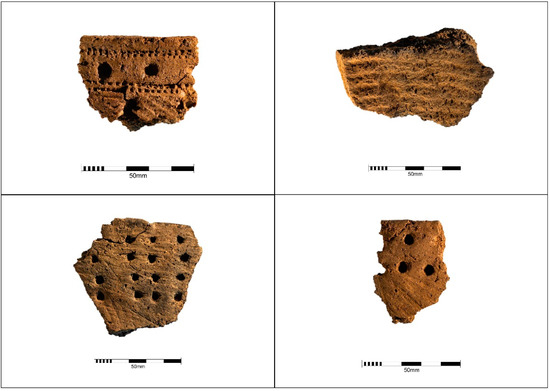 Kiukainen ware forms its own uniform group that differs from preceding or contemporary pottery styles in the Northern Baltic Sea region. The vessels are thick-edged and rough-made, always flat-bottomed, and are usually straight-edged designs. Mild profiling also occurs sometimes. The vessels vary in size from small beakers to large storage vessels, but most are a few litres in size. Clay material was often mixed with crushed stone or sand, but organic temper or limestone was often used as well, causing the ceramics to be porous. Only the upper part of the surviving vessels is decorated. However, the lower undecorated parts often contain a textile imprint. The decoration consists of horizontal rows of pits, dots, lines, comb or ring stamps, and sometimes, spiral cord prints (Figure 2). Horizontal or vertical zig-zag lines are also typical. Though other decorations have also been found on vessels, the vessel is usually decorated only with pits and one other decorative element; for more, see [1,2,5].