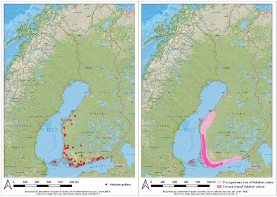 After analysing and recognizing Kiukainen pottery, the coordinates of site locations confirming a connection to the culture were collected from the Register of Ancient Monuments. The Finnish Heritage Agency maintains and updates the register. The register includes information about site type, location, possible dating, descriptions, and possible links to research reports. Sites also have a name and individual number code, which are used to list the sites. Every archaeological site in the register has coordinates in point format, and most of the sites have protected area definitions in polygon format. All information about archaeological sites in Finland is open-access form. The register can be found at the Finnish Heritage Agency’s website, at its Cultural Environment service window (Kulttuuriympäristön palveluikkuna), but only in Finnish [21]. It is also possible to download the register for GIS use or else use it in GIS programs via open geographic information interfaces (VMS and VFS forms). After downloading the site register, it was possible to identify and list all sites where Kiukainen pottery has been found with the QGIS program. However, some sites excavated decades ago are not in the register, so some of those site locations are uncertain. Additionally, a few sites located outside the present borders of Finland (the Karelia area of Russia) were left out because the locations of those sites are uncertain. Sites located in the Åland Islands were identified using the Kulturarv website [22], updated by the Åland provincial government.
