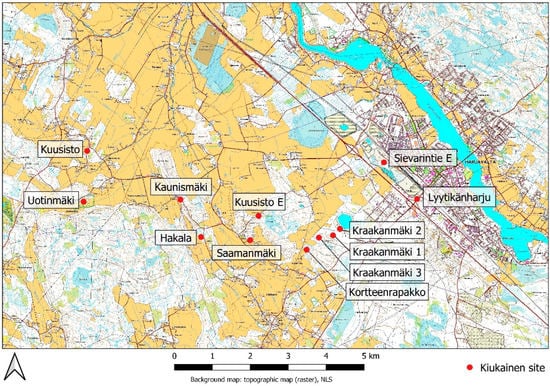 The landscape in Harjavalta is quite different than in the Kemiönsaari area. In Harjavalta, the topography is a plane, and sites are located in small, forested areas near cultivated fields (Figure 7). The Kiukainen culture was discovered and named after the settlement site of Uotinmäki in the area at the beginning of the 20th century. In addition to Uotinmäki, archaeological excavations were carried out at Kaunismäki and Saamanmäki, the results of which have been presented in the book Die Kiukaiskultur [2]. Later, excavations were also done at the Lyytikänharju site, which nonetheless dates mainly to the time of the Pyheensilta group [31,32]. In recent years, residences named Kraakanmäki 1–3 have been investigated, with newer research results and C14 dates available from two of the excavations [33,34].