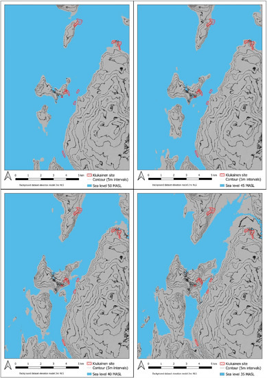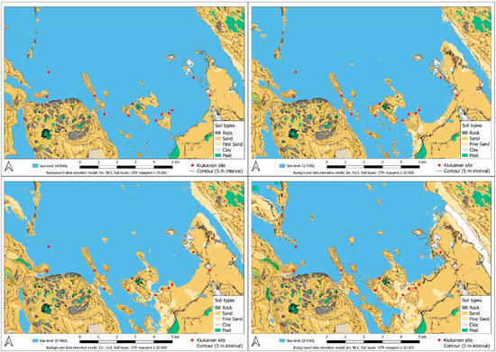 The maps clearly show how the environment changes quickly as the land rises from the sea (Figure 8). It seems likely that, due to such changes, many residences would have soon been located far from the beach and, thus, probably subject only to short-term use. On the other hand, due to the steeper topography, Uotinmäki, Kaunismäki, and Saamanmäki remained constantly close to the seashore, making them habitable from one century to the next. Kuusisto’s site remained underwater throughout the Stone Age and only emerged from the water during the Bronze Age. However, Kiukainen pottery has been found at the site, so either the information about the height of the place is inaccurate or Kiukainen-type pottery was, perhaps, used relatively late in the Bronze Age.