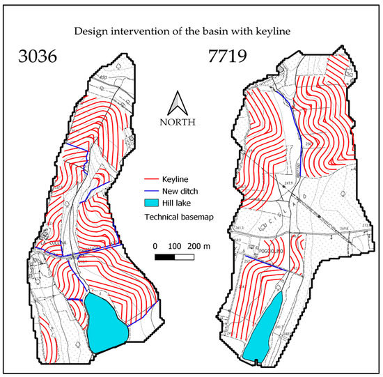 The runoff with the keylines, obtained from the simulation using the SIMWE, is less than in the previous conditions (Figure 6 and Figure 7). We notice a general reduction in the runoff in the whole area where the keylines are present, without changing the flow direction, as the terrain does not undergo changes from an elevation point of view, only the physical characteristics of the soil vary in terms of the infiltration. In fact, the outflow follows the same direction before and after keylines are added, but it is reduced in absolute terms, as more water is retained on the slopes. In statistical terms, the mean water discharge value of all the pixels in the simulation with the keyline is lower for each of the basins (Table 1). Basin 3036 shows a reduction of 8%, and basin 7719 shows a reduction of 12%. The difference between the basins is consistent with the dimensions, and 7719 is flatter than 3036.