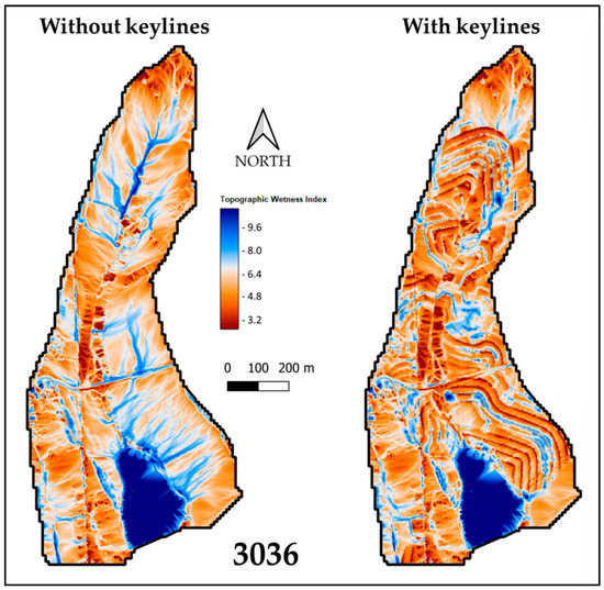 Topographic Wetness Index (TWI) maps with and without the keylines for basin 3036.