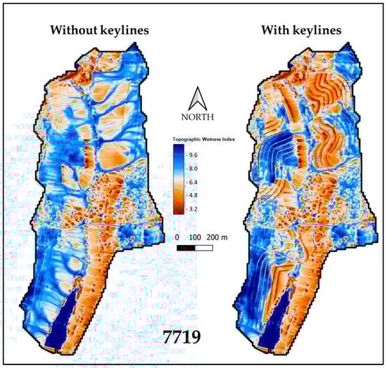 Topographic Wetness Index (TWI) maps with and without the keylines for basin 7719.