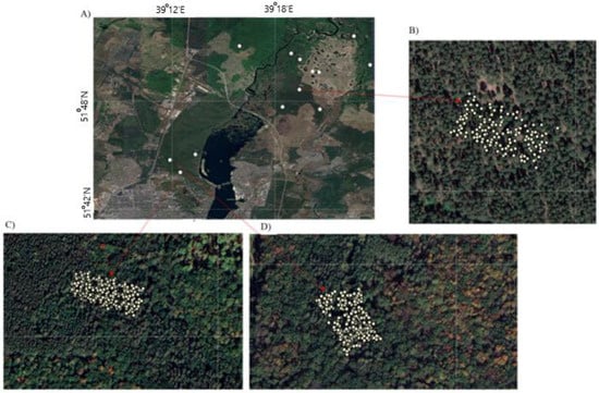 Study sites are located on the territory of Suburban Forestry in the Central Chernozem Region (the northern part of Voronezh Region, Russia) and represented natural and artificial forest stands of various tree species inherent to Central Forest-Steppe (Figure 1A) Geographical location of study sites in the Suburban Forestry; B, C, D) Placement of trees in the study areas within the polygon.