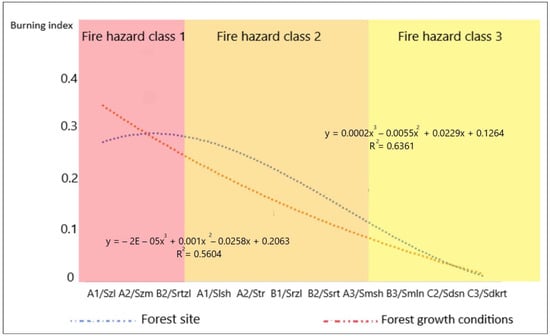 Regression analysis was performed to establish the relationship between the burning indices and forest growth conditions/forest types. The results of the initial data alignment are shown in Figure 2.