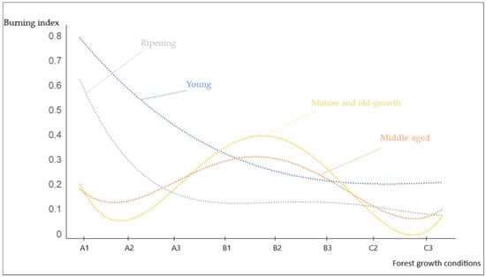 Regardless of the type of forest growth conditions young forests have the highest burning index. Mature stands are characterized by the highest resistance to fires in dry and fresh types of forest growth conditions. This pattern was previously noted by many authors []. At the same time, pine stands do not reduce their fire resistance up to 200 years of age. According to B.P. Tikhomirov [], growth is often observed not only in diameter, but also in height of pine trees 300 years old in Central Siberia and Transbaikalia. It was established that burning index is approximately the same in all age groups (except for young tree stands) in moisty forest growth conditions (A3, B3, C3).