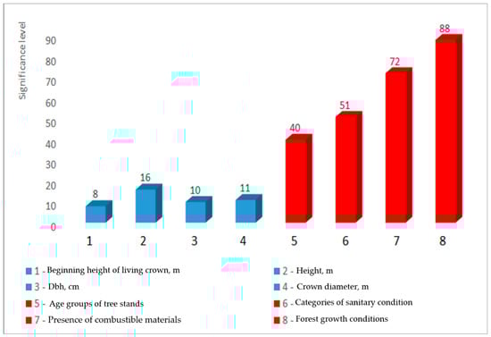 One-way ANOVA was used to identify the influence of individual factors. Results of analysis shows studied forest stand characteristics has no any key influence on the fire occurrence (Table 8). Therefore, a set of features should be considered for establishment of significance levels, which were calculated according to the Fisher criterion Figure 4.