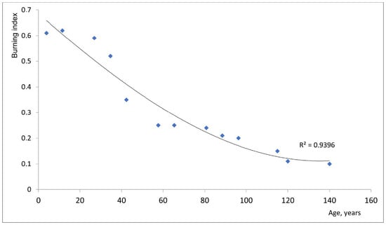 Figure 5 shows burning indices change depending on the age of the stand. Approximation of the data was provided by second-degree polynomial function with a high value of determination coefficient.