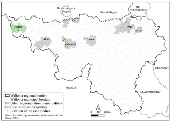 Location of the Walloon urban agglomerations and the case studies [28].