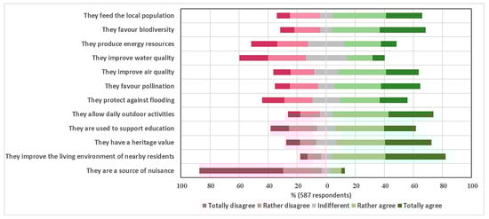 Additionally, we conducted an e-survey on the perception of agricultural lands and their functions. The aim was to collect a third point of view, besides the farmer and local authorities, on the roles of these lands. The target population was the Walloon population. We contacted the population via mailing lists and social networks and collected 587 responses. The questions address attachment, uses, and perceptions of agricultural lands. Most of the questions were formulated via Likert items of four levels. Even if the sampling technic presents biases because only the people interested in the topics took time to answer, it gives an insight into the perception of different services provided by agricultural lands in Wallonia (Table 1). Our sample comprises a majority of women and includes people between 18 and 79 years (with an average age of 36 years). As a result, women and young people are over-represented in our sample. Three living environments emerge among the respondents to the survey: 44.8% consider themselves to live in a village, 27.6% in the urban periphery, and 12.1% in the city centre. In addition, more than half of the Walloon respondents live near agricultural land (54.3% consider living within 500 m of the nearest agricultural land).