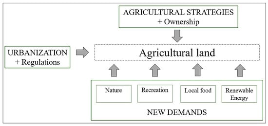 In Wallonia, the absence of a clear territorial framework and project to support multifunctional agriculture in urban and peri-urban areas led to a lack of clarity regarding the future of agricultural land at the edges of Walloon cities. Based on the case studies, Figure 3 distinguishes three types of driving forces influencing agricultural estates at the edges of Walloon cities.