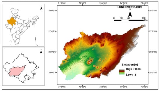 Luni, the largest river basin in Rajasthan (India), is located between latitude 24°30′ N to 27°10′ N and longitude 70°49′ E to 75°04′ E (Figure 1). Geographically, it is located adjacent to the western part of the Aravalli Range and occupies an area of 68,939 km2. The basin covers the districts of Ajmer, Jodhpur, Nagaur, Barmer, Jalore, and Sirohi in part and the district of Pali in full. The elevation ranges from −5 to 1613 m from the mean sea level (MSL), with a decreasing gradient from the northern to the southern part of the basin. In this basin, rainfall occurs mostly from June to September (>90%), and it ranges from as high as ~1000 mm in the southern and eastern parts to as low as ~234 mm in the western part of the basin [39]. The annual maximum potential evapotranspiration in the river basin is 1850 mm, and it is the highest (260 mm) in May and the lowest (77 mm) in December [39]. The study area, with the characteristics of low rainfall, high temperatures, and low relative humidity, has an arid to hyper-arid climate [40].