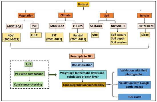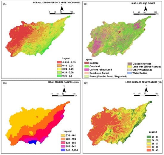 In the present study, nine input layers were used to identify the area most vulnerable to land degradation, namely, the normalized difference vegetation index (NDVI) from a moderate-resolution imaging spectroradiometer (MODIS), land surface temperature (LST) from MODIS, mean annual rainfall from the Climate Hazards Group Infrared Precipitation with Station data (CHIRPS), land use/land cover (LULC), slope, soil texture, soil erosion, soil depth, and soil organic carbon. The United States Geological Survey (USGS) website was used to download the shuttle radar topography mission (SRTM) DEM data (https://earthexplorer.usgs.gov (accessed on 29 June 2022)). A land use/land cover (LULC) map was downloaded from ESRI [41]. MODIS NDVI, MODIS LST, and CHIRPS rainfall were downloaded for the 21-year period of 2001–2021 using Google Earth Engine (GEE). Land degradation, particularly wind erosion and desertification, cannot be assessed during a short period of time, such as a few years or less; it should be evaluated over a long period of time [42]. So, we used long-term mean data (21 years) to evaluate land degradation vulnerability. Soil organic carbon data were downloaded from SoilGrids (https://soilgrids.org/ (accessed on 25 June 2022)). Additionally, data on soil texture, soil erosion, and soil depth were collected at a scale of 1:250,000 from the ICAR-National Bureau of Soil Survey and Land Use Planning (NBSS&LUP), Nagpur. All thematic layers were converted to the WGS 1984 datum and Universal Transverse Mercator (UTM) 43N coordinate system. Table 1 provides an overview of various datasets and their specifications.