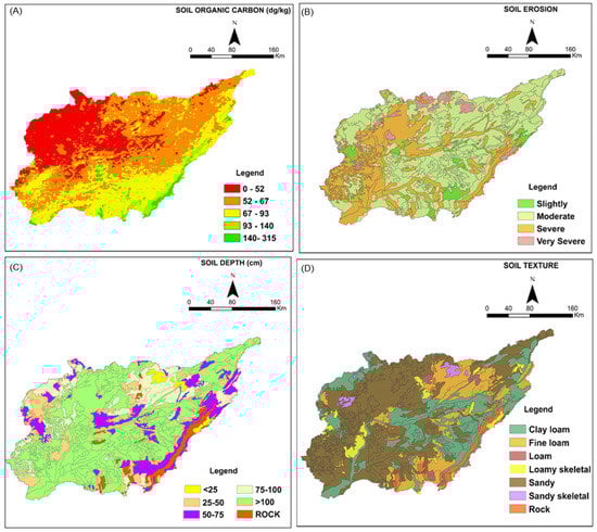 The study area was classified into five subclasses of SOC content, namely, 0–52, 52–67, 67–93, 93–140, and 141–315 decigrams/kg (Figure 4A). The maximum area (42.1%) of the study area falls under subclass 52–67 decigram/kg, followed by subclass 67–93 (26.9%), whereas the lowest area (1.6%) falls under the 141–315 decigram/kg subclass. The northwestern part of the study area has a low SOC as compared to the southeastern part, which is an important factor for the stability of the soil structure. The soil erosion map of the study area is depicted in Figure 4B, and four erosion classes were identified. The study area is mainly composed of moderate soil erosion (56.3%), followed by severe erosion (35.2%), and very severe erosion occurs the least (4.2%). Severe and very severe erosion are mainly concentrated in the western part, and moderate erosion is found in the eastern part of the study area. The soil depth map is presented in Figure 4C, and six subclasses were identified according to the ICAR-NBSS&LUP, Nagpur, India. The highest area falls under subclass >100 cm (59%), and the lowest area falls under subclass <25 cm, with an area of 1.9%. The soil in the study area was classified into different texture classes, namely, clay/fine loam, loamy skeletal, sandy skeletal, and sandy soils (Figure 4D). The study area is mainly composed of sandy soil (49.5%), followed by clay loam (24.4%), with loam representing the least amount (1.1%). The western part of the study area is dominated by sandy soil, whereas the eastern part is dominated by fine loam and clay loam texture.