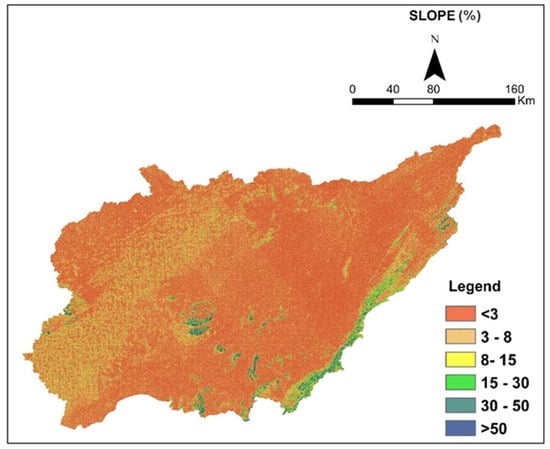 The study area’s slope was divided into six subclasses, namely, <3, 3–8, 8–15, 15–30, 30–50, and >50% (Figure 5). Almost 62% of the area of the basin falls under the slope subclass of <3%, which is nearly flat and mainly concentrated in the northern and eastern parts of the basin. The slope of the remaining 38% of the area falls under subclass >3%. The eastern and southeastern parts are mainly composed of high slopes.