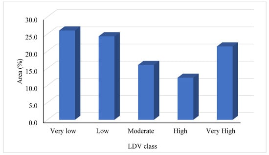 Before the thematic layer integration, consistency ratios for each thematic layer (Table 4), normalized matrix (Table 5), and thematic layer subclass (Table 6) were computed. The findings show that the judgment matrices used in the analyses were reasonably consistent and accurate (CR ≤ 0.10). The NDVI, LST, rainfall, topography, and pedological parameters were computed and the final weightage assigned to each parameter was computed using the AHP model. The weighted overlay approach was used to integrate the thematic layers according to their associated weights. AHP found that NDVI had the highest priority in land degradation vulnerability zone (LDVZ) identification, with a weight value of 0.27, followed by rainfall (0.22), LST (0.15), erosion (0.12), slope (0.08), LULC (0.06), SOC (0.22), texture (0.22), and depth (0.22). In this study, with the help of the AHP- and the GIS-based modeling approach, five LDVZs, namely, very low, low, moderate, high, and very high, were identified (Figure 6). The findings show that 50.3% of the river basin area (34.72 lakh ha) is highly vulnerable to land degradation, and it was classified in the very low to low class, accounting for nearly half of the river basin (Figure 7). These very low to low classes of LDV cover the eastern, southern, and northeastern parts of the study area. About 11.02 lakh ha (16.0%) of the river basin area falls under the moderate class of land degradation, mostly covering the central to southeastern parts of the study area. The high and very high classes of land degradation vulnerability cover about 23.19 lakh ha (33.7%) of the river basin area. The western and somewhat central portions of the study region mostly fall under these classes. These two classes particularly indicate wind erosion, which is one of the most severe forms of land degradation.