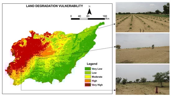 Land is an essential part of the supportive ecosystem of the Earth. Humans and animals are dependent on the ecosystem services, such as food, fiber, and shelter, provided by this natural resource [1]. Resource degradation is one of the hottest topics of research at present due to its alarming threat to biodiversity [2]. Land degradation is nothing but the unsustainable over-exploitation of resources resulting in decreasing productivity and capabilities to provide a set of ecosystem services [3,4]. The international forum United Nations Convention to Combat Desertification (UNCCD) reports the degradation of land resources to be a challenging concern [5,6]. Moreover, increasing food demand, anthropogenic activities, and changing climatic scenarios altogether put immense pressure on land resources, leading to degradation [7,8].