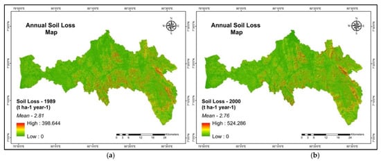 Annual soil loss for specific LU/LC types of MORB in years 1989, 2000, 2009, and 2021.