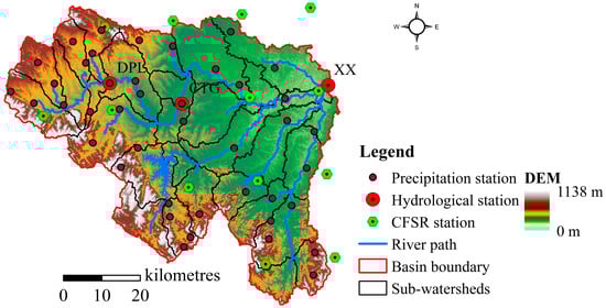 Xixian watershed (XXW) is located in the upper area of the Huaihe River Basin in China, with an area of 10,229 km2, between 112° and 121° E and 31° and 35° N (Figure 1). XXW originates from Tongbai Mountain, with an elevation between 0 (lowest) and 1138 (highest) m upper sea level. The watershed is located in the transition region between the warm temperate zone and the northern subtropical zone [], with diverse terrain (containing mountains, hills, and flat areas). Within XXW, the annual average temperature is about 11–16 °C, and the average annual precipitation is about 950 mm and varies from 800 to 1000 mm across this area []. The rainy season ranges from May to October, with about 60% of the total annual precipitation.