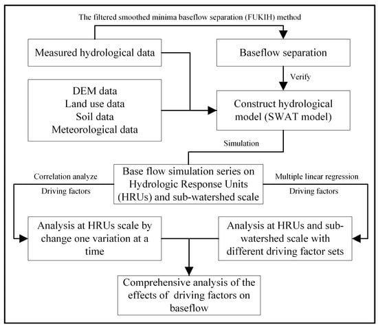 (1) The filtered smoothed minima baseflow separation (FUKIH) method [] was used to examine the baseflow ratio of the XXW and to guarantee the proportion of baseflow and surface flow was simulated appropriately in the SWAT model. (2) The SWAT model was built to simulate the hydrological process for different underlying surface conditions. (3) Some driving factors were selected to analyze their effects on the baseflow. (4) Two statistical methods (correlation analysis and multiple linear regression) were used to analyze the relationships between the driving factors and baseflow. (5) We compared the results with two statistical methods and found a comprehensive relationship between these driving factors and baseflow, which can better predict baseflow.