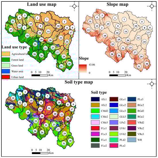 Distribution of land use, slope, and soil type within the XXW. Numbers (1–31) with circles indicate subwatershed numbers. The number after the soil type code indicates the soil texture. “ATc”, “CMd”, “CMe”, “FLc”, “Fle”, “Gle”, “GLk”, “LPe”, “LVh”, “PLd”, “PLe”, “RGc”, “RGd”, “RGe”, “VRd”, “VRe”, and “WR” represent cumulic anthrosols, dystric cambisols, eutric cambisols, calcaric fluvisols, eutric fluvisols, eutric gleysols, calcic gleysols, eutric leptosols, haplic luvisols, dystric planosols, eutric planosols, calcaric regosols, dystric regosols, eutric regosols, dystric vertisols, eutric vertisols, and water bodies, respectively.
