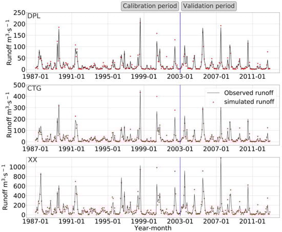 Comparison between the measured and simulated runoff values for the SWAT model in the DPL, CTG, and XX stations.