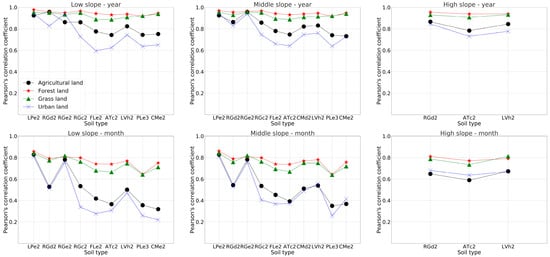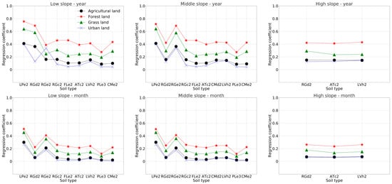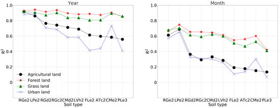 The MLR was performed for different combinations of land use and soil type, according to the formulation shown in Table 1 on a monthly and yearly scale, and the results are shown in Figure 7 and Figure 8. On the yearly scale, the range of the R2 of each MLR formulation for agricultural land, forest land, grass land, and urban land was 0.56–0.92, 0.85–0.94, 0.81–0.92, and 0.41–0.88, respectively. On the monthly scale, the range of the R2 of each MLR formulation for agricultural land, forest land, grass land, and urban land was 0.13–0.69, 0.42–0.75, 0.42–0.7, and 0.07–0.65, respectively. The R2 for different land use was ranked as “forest land > grass land > agricultural land > urban land” for most soil types.