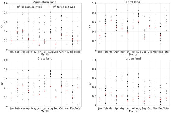 The R2 of each MLR formulation for different combinations of land use and soil type in different months. The form of the formulation was shown in Table 1. The R2 for each soil type was the R2 of the MLR formulation for the HRUs with each different soil type and specific land use type. The R2 for all soil types was the R2 of the MLR formulation for the HRUs with all the different soil types and specific land use types. For example, in the first subfigure, the different black points represent the R2 of the MLR equation established based on the data in the HRUs with a single soil type and agricultural land; while the red points represent the R2 of the MLR equation established based on the data in the HRUs with all soil type and agricultural land.