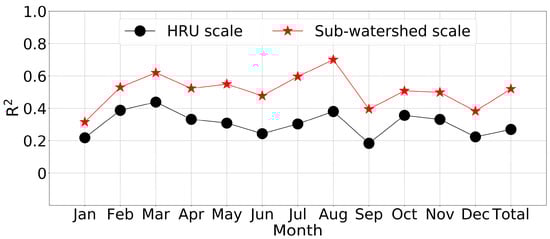 The R2 of the MLR formulation for different months at HRUs and sub-watershed scales.
