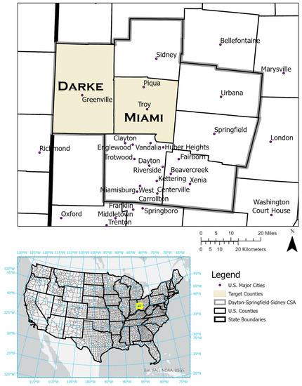 The study area consists of two counties in the midwestern United States of America (U.S.A.): Darke and Miami counties. Both are located in Southwest Ohio and sit within the Dayton-Springfield-Sidney Combined Statistical Area delineated by the U.S. Census Bureau. Combined Statistical Areas are defined by the Census Bureau as “the county or counties (or equivalent entities) associated with at least one core (urbanized area or urban cluster) of at least 10,000 population, plus adjacent counties having a high degree of social and economic integration with the core as measured through [strong] commuting ties”. Both Darke and Miami counties contain medium-sized cities (Greenville, Troy, and Piqua) and exhibit suburban to rural urbanization patterns, especially moving north, i.e., away from Dayton, Ohio (Figure 1). Except for the urbanized areas with strong suburban and exurban (peri-urban) development, the region is mostly agricultural, dominated by corn and soybeans, with some forest remnants.