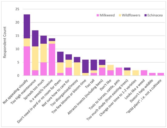 The most oft-stated reasons respondents mention why not to add the plants shown in the survey are a general dislike for the appearance of the plants (especially for A. syriaca, and E. purpurea), that the plants require or are perceived to require more maintenance than the respondent is willing or has the ability to expend, that the plant(s) spread too much on their own, and for A. syriaca that it is considered a weed or invasive plant (Figure 2). Please note that these are reasons specified by the respondents in an open-ended portion of the survey, i.e., there were no predetermined answer choices for this question on the survey. Overall, the reasons respondents list as to why they might not want to add E. purpurea, A. syriaca, and wildflowers to their landscaping overwhelmingly have to do with visual appeal and appearance, maintenance considerations or lack of knowledge of how to care for these plants, and considerations about the plants spreading beyond the planted area, as well as for A. syriaca concerns about it being a weed, or an invasive, or toxic to pets and livestock.