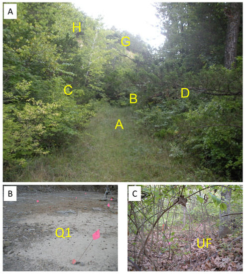 Photographs of study plots in (A) a quarry abandoned 70 years prior to the study (Q70), (B) a reference quarry that ceased operations 1 year prior to the study (Q1), and (C) an urban forest reference site that was never quarried and with trees over 100 years old (UF). Letters indicate approximate locations of study plots in Q70; plots A–D are on the quarry floor (Plot E is not visible), plots G and H are on the quarry top (Plot F is not visible). Plots Q1 and UF are in sites with the same respective names. Photos are directed south, north, and south for the three sites, respectively. The climate station is seen in Q1; pink flags indicate locations of sampling quadrats. All study sites are within city limits of Jefferson City, MO, USA.