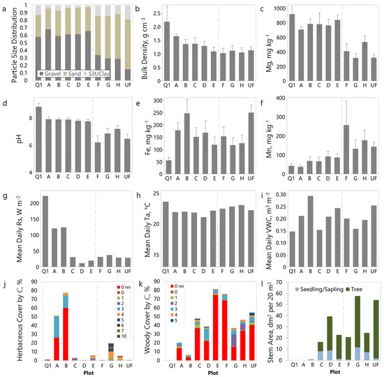 Select soil physical (a,b) and chemical (c–f) characteristics, microclimate (g–i), and vegetation composition characteristics (j–l) in eight plots of a 70-year-old abandoned quarry (Plots A–E: quarry floor, F–H: quarry top), a recently decommissioned reference quarry (Q1), and an urban forest reference site (UF) in Jefferson City, Missouri, USA. The vertical dashed line separates quarried surface (left) and non-quarried surface (right). Error bars, if shown, represent 1 SD (n = 20 quadrats). Microclimate data (g–i) are shown for the growing season (1 May–30 September); error bars are omitted as they would show temporal variation that was almost identical between sites. Rs—shortwave radiation, Ta—air temperature, VWC—volumetric water content. C is the Coefficient of Conservatism; 0 nn is C = 0 for non-native species. Woody cover (k) is from plants 0–2 m high.
