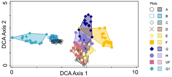 Results of unconstrained Detrended Correspondence Analysis (DCA) showed clear delineation of most of the ten study plots based on species composition alone (Figure 4). The first three axes cumulatively explained 20% of the total variability of the species dataset. Along the first axis, sparsely vegetated Q1 plot and Q70 plots A and B (with herbaceous vegetation only) are separated from all other plots. Along the second axis, more species-diverse plots also including woody species are separated into two groups: plots at the Q70 quarry top (F–H) and quarry floor (C–E). Site F differs from other Q70 quarry top plots G and H due to the sporadic presence of just a single herbaceous species in the understory (Table S3). The plant community at UF reference plot was similar to those plots at the Q70 quarry floor (C, D) and platform (E) with dense woody understory.