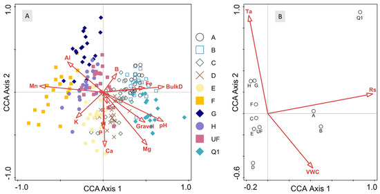 The CCA, using soil characteristics as environmental predictors, was conducted at the quadrat level (n = 200 quadrats); this would not have been possible at the plot level with the number of explanatory variables (soil physical: four, soil chemical: 12) exceeding the number of plots (n = 10). Initially, highly autocorrelated environmental variables were eliminated; i.e., of the three particle size distribution variables gravel, sand, silt/clay, only gravel was retained. All variables retained had a Variance Inflation Factor (VIF) less than 6. Then, statistically significant (p ≤ 0.05) explanatory variables were selected via forward selection; in this process, Zn and Na were found to be not significant and were eliminated from the analysis.