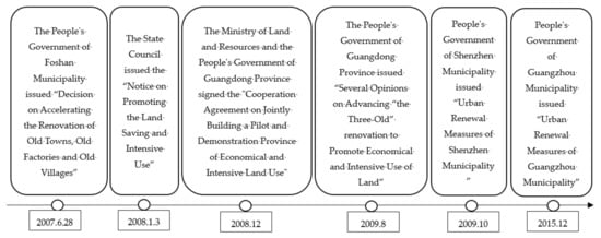 There needs a specific explanation about the reason for focusing on urban renewal rather than on the renovation of “the three-old” policy in Guangdong Province. As shown in Figure 1, the renovation of “the three-old” policy originated from the practice in Foshan. It is a unique transformation mode in Guangdong Province of China, which refers to the renovation of old towns, old factories, and old villages. The implementation of “the three-old” renovation is to alleviate the contradiction between supply and demand of land resources, to realise the redevelopment of urban stock of inefficient construction land, and to implement the national strategy of economical and intensive use of land. With the comprehensive opening of “the three-old” renovation, Shenzhen issued the “Urban Renewal Measures of Shenzhen Municipality” in October 2009, which was the first time that the concept of “urban renewal” was put forward by a local government. In 2014, the focus of China’s urban work shifted to the renovation of shanty areas. In December 2015, the People’s Government of Guangzhou Municipality issued the “Urban Renewal Measures of Guangzhou Municipality”, which included land acquisition and dismantlement, renovation of “the three-old”, renovation of shanty areas, renovation of dilapidated old houses, and comprehensive improvement. It can be seen that “the three-old” renovation is a form of urban renewal, which is a special exploration of urban renewal in a specific period and region. Therefore, this paper adopts the “Urban Renewal Measures of Guangzhou Municipality” as the policy research sample of Guangzhou.