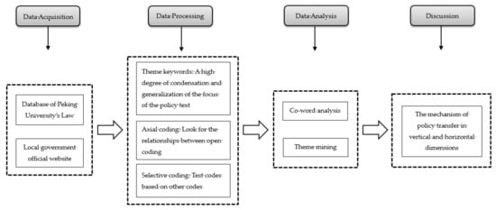 The rest of the sections in this study are as follows: Section 2 introduces the data sources and research methods. Section 3 describes the policy transfer theory. In Section 4, co-word analysis and the Gephi software are used to analyse 216 urban renewal policy texts sorted out at the state level and at the city level, including Beijing, Shanghai, Guangzhou, and Shenzhen. Section 5 evaluates transferred policies between “state-city” and “city-city” based on the above classification of the four types. Finally, this study proposes an effective approach for policy transfer for urban renewal in China.