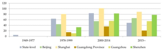 In 1978, China entered the initial stage of comprehensive reform and opening up. The development of urban industry caused serious environmental pollution and a shortage of housing for urban workers. Therefore, the focus of urban renewal during this period was on solving the housing problem and on the upgradation and transformation of old industrial and commercial areas. In March 1978, the State Council held the Third National Urban Work Conference in Beijing and proposed measures to accelerate housing construction [132]. These actions guided urban renewal in this period. Beijing and Guangzhou vigorously promoted the renovation of dilapidated and aged houses, while Shanghai focused on the tract dismantlement and renovation of dangerous sheds and shabby houses, and the protection of historical features. As the Shenzhen Special Economic Zone had just been established, urban construction started from scratch, mainly focusing on new land development which was accompanied by small-scale demolition and construction to improve office and residential conditions. However, the selection of a new urban area as the construction land at that time led to the further deterioration of the old city environment. During this period, driven by the reform of the economic system, the relationship between the central and local governments in China gradually broke the pattern of highly centralised power and showed the characteristics of power tilting towards the local level. With the promulgation of China’s first “Urban Planning Regulations” [133] and “Urban Planning Law” [19], China’s urban development stepped into the right track, and the policies of the four cities in terms of land, planning, housing, and demolition gradually increased. It could be seen that, at this time, the source of policy transfer was still the state, but local governments had more autonomy to lead the urban renewal activities in their region.