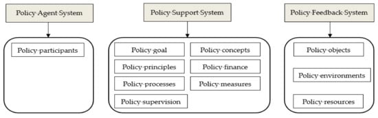 Finally, we extracted 11 axial codes on policy, including the goal, concepts, principles, participants, objects, environments, resources, finance, processes, measures, and supervision of each policy. Three selective codes were also extracted—policy agent system, policy support system, and policy feedback system—which constitute the framework of the policy analysis (shown in Figure 4). The tables of the axial coding and selective coding at the state level and city level are provided in Table 3, Table 4, Table 5, Table 6 and Table 7.
