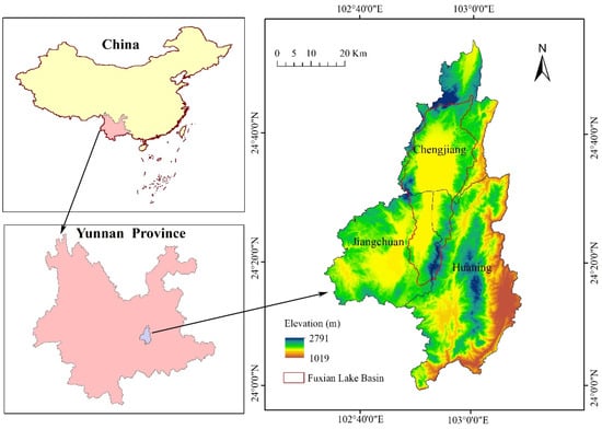 The Fuxian Lake basin (24°21′–24°38′ N and 102°49′–102°57′ E) [40] with an area of 68,725 hm2, is located in Yuxi City, Yunnan province, in the central Yunnan basin. The Fuxian Lake basin has a typical subtropical subhumid monsoon climate, with an average annual temperature of 15.5 °C and spans across the Jiangchuan, Huaning, and Chengjiang counties/districts (Figure 1). It is dominated by plateaus and hilly landforms. In the basin, there are primarily four types of soil: red soil, brown soil, purple soil, and paddy soil. The rural economy in the basin is dominated by the planting industry and the tourism industry has developed rapidly. Fuxian Lake is a north–south tectonic depression belonging to Nanpanjiang River system and is the largest deep-water freshwater lake in China. The elevation of Fuxian Lake is about 1723.35 m a.s.l. with an area of 216.6 km2, average depth of 95.2 m, and capacity of 108 m3.